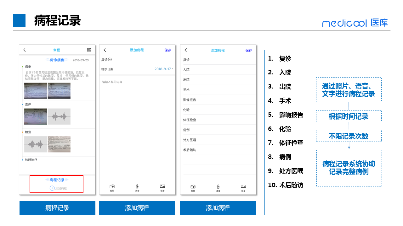 其次,通过病例征集延伸到医患随访、患者管理。医生有专属二维码,线下患者使用微信扫描添加医生,医生患者建立联系在线沟通。患者在线咨询的同时可以把自己复诊、出院、术后、检验报告等后续的病例资料图片传给医生。医生根据线上沟通信息和购药数据对患者添加随访和病例记录,对患者建立起全诊疗周期的完整病例,更好地帮助患者管理疾病。
