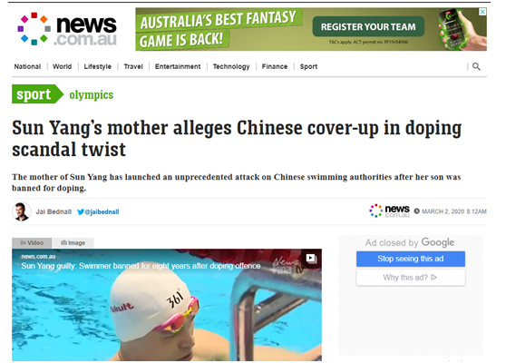 澳洲新闻网也对此报道,标题为《孙杨的母亲指控中国掩盖了兴奋剂丑闻》