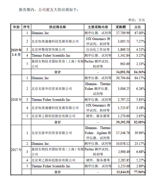 招股书显示,2016年、2017年、2018年和2019年上半年,诺禾致源从Illumina采购额占当期采购总额的比例为 15.92%、23.17%、64.17%和 67.00%。可见,诺禾致源较大地依赖于Illumina,并且占比逐年增大。