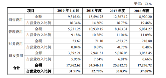 可见,2019年上半年,诺禾致源销售费用是研发费用的2.75倍,2018年,公司销售费用是研发费用的1.96倍,且销售费用年年大幅增加。另外,报告期内,公司销售费用率分别为16.11%、19.46%、16.73%、14.80%、16.34%。