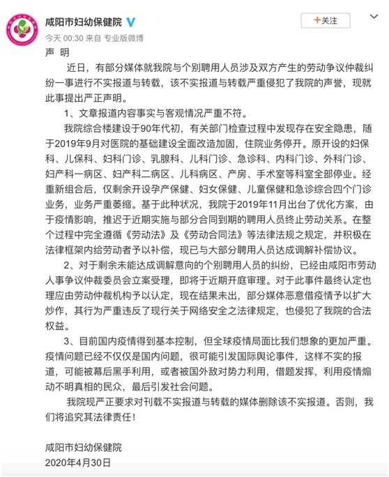 4月30日,咸阳市妇幼保健院官方微博发布消息称,2019年9月医院对基础建设全面改造加固,住院业务停开,经重新组合后,医院业务严重萎缩。基于此种状况,医院于2019年11月出台了优化方案,由于疫情影响,推迟于近期实施与部分合同到期的聘用人员终止劳动关系。