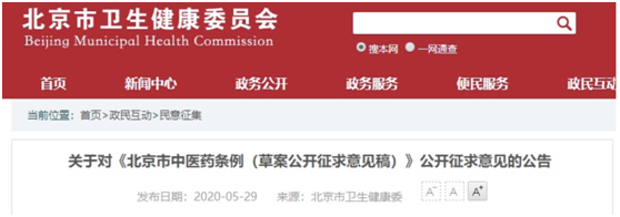 北京市卫健委发布《北京市中医药条例(草案公开征求意见稿)》及说明,公开征求意见,时间为2020年5月29日至6月28日。条例的征求意见稿一共分为七章,分别为总则、中医药服务与保障、中医药规范与管理、中医药保护与传承、中医药开放与创新、法律责任和附则,共计五十五条。内容主要包括完善中医药服务能力建设、完善从业机构和人员管理制度、推进中药服务管理制度创新发展、完善中医药人才队伍建设、完善中医药文化保护和传播制度、完善中医药发展保障机制等六个方面。草案中提出建立中医文化宣传舆论保护制度,对以任何形式诋毁、污蔑中医药的行为,依法追究治安、刑事责任。其中,征求意见稿的第三十六条规定,“任何组织或者个人不得对中医药作虚假、夸大宣传;不得冒用中医药名义牟取不正当利益、损害社会公共利益;不得以任何方式或行为诋毁、污蔑中医药。”第五十四条规定,“违反本条例第三十六条第二款之规定,诋毁、污蔑中医药,寻衅滋事,扰乱公共秩序,构成违反治安管理行为的,由公安机关依法给予治安管理处罚;构成犯罪的,依法追究刑事责任。”