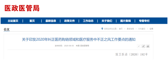 根据同时发布的《2020年纠正医药购销领域和医疗服务中不正之风专项治理工作要点任务分工表》分工表要求,年底前,由国家卫健委牵头,各成员单位按照职责分工配合,规范医商合作交往途径。明确行业学协会、医疗机构与医药相关企业间行为底线,制定医务人员对外交往行为规范。严厉打击假借学术会议、科研协作、学术支持、捐赠资助进行利益输送的不当行为。7月23日,国务院办公厅印发《深化医药卫生体制改革2020年下半年重点工作任务》,提到完善医疗卫生行业综合监管协调和督察机制。制定医疗卫生行业综合监管责任追究及督察机制政策文件等。7月24日,国家卫健委办公厅发布的《关于印发2020年医疗行业作风建设工作专项行动方案的通知》也明确,从今年7月开始直到年末,将重点整治医务人员收取回扣、药企违规营销等行为。结合最近医疗行业频频出现举报的现象来看,近期安徽多家三甲医院贴出了匿名举报信,山西临汾市医院和河北某医院门口也出现了举报信。在国家集采和价格谈判背景下,前三批全国集采市场缩水较大,无论是仿制药还是创新药,利润空间进一步减少,使得竞争加剧,整个行业的合规压力都在飙升。医疗卫生领域正风反腐相关措施密集发布,典型案件通报曝光力度加大。一方面,加强对医院公职人员的监督和管理,有利于减少医院寻租和实施腐败的空间。另一方面根治医疗领域的腐败之风要从根源抓起,规范医药企业、经销商的营销行为,建立合法合规的营销途径。