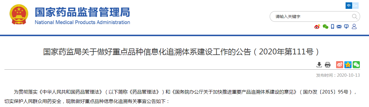 10月13日,国家药品监督管理局正式对外发布了“关于做好重点品种信息化追溯体系建设工作的公告”(以下简称“公告”)。公告显示药品上市许可持有人应当落实全过程药品质量管理的主体责任,建立信息化追溯系统,收集全过程追溯信息,于2020年12月31日之前,基本实现国家药品集中采购中选品种、麻醉药品、精神药品、血液制品等重点品种可追溯。国家药监局负责制定统一的药品追溯标准和规范。截至目前,药品信息化追溯体系建设的8个标准已全部发布实施,包括《药品信息化追溯体系建设导则》《药品追溯码编码要求》《药品追溯系统基本技术要求》《药品上市许可持有人和生产企业追溯基本数据集》《药品经营企业追溯基本数据集》《药品使用单位追溯基本数据集》《药品追溯消费者查询基本数据集》《药品追溯数据交换基本技术要求》。既然要在2020年12月31日之前,基本实现国家集中采购的药品品种可追溯,还有哪些任务呢?1、国家药监局建设药品追溯协同服务平台(以下简称协同平台),不断完善药品追溯数据交换、共享机制。2、协同平台提供药品追溯码编码规则备案和药品上市许可持有人药品信息化追溯系统(以下简称追溯系统)地址解析服务,辅助实现不同追溯系统互通互享,实现药品全过程可追溯。省级药品监管部门:建立本省追溯系统,监控药品流向。1、各省级药品监管部门根据监管需要建设本省药品信息化追溯监管系统,进行数据采集,监控药品流向,充分发挥追溯信息在日常监管、风险防控、产品召回、应急处置等监管工作中的作用。药品上市许可持有人、药品经营企业:承担系统建设主要责任1、药品上市许可持有人、药品经营企业应当按照《药品信息化追溯建设导则》等标准和规范要求,建立并实施药品追溯制度,提供追溯信息,保证药品可追溯。2、药品上市许可持有人承担追溯系统建设的主要责任,可以自建追溯系统,也可以委托第三方技术机构建设,按照统一的药品追溯编码要求,对药品各级销售包装单元赋以唯一追溯标识。3、同一药品追溯码,只允许在同一追溯系统中实现追溯。如企业要变更追溯码或追溯系统,可按照要求在协同平台进行变更。在生产入库时,应在追溯系统中保存入库信息,在销售药品时,应通过追溯系统向下游相关企业或医疗机构提供相关追溯信息,以便下游企业或医疗机构验证反馈。药品上市许可持有人要做到及时、准确获得所生产药品的全过程信息。4、进口药品上市许可持有人可委托进口药品代理企业履行追溯系统建设责任。5、药品经营企业在采购药品时,应通过追溯系统向上游企业索取相关追溯信息,在药品验收时进行核对,并将核对信息通过追溯系统反馈上游企业;在销售药品时,应通过追溯系统向下游企业或有关机构提供追溯信息。药品追溯体系的前身是药品电子监管码。2006年起,原国家食药监总局开始推行药品电子监管,并采用“药品电子监管码”针对药品进行生产及流通过程中的状态监管,但这一方式最终因数据安全等问题在2016年被叫停。药品从生产到使用,链条长、环节多,一旦出现问题很难进行责任判定,是原材料供应商、医药生产企业、批发代理企业、销售平台、运输方、医疗机构、消费者哪个环节出了问题。而统一的药品追溯标准规范有助于打通各环节、企业独立系统之间的壁垒,有利于构建药品追溯数据链条,有利于实现全品种、全过程药品追溯。药品信息化追溯体系建设的8个标准已全部发布实施,据此,药品追溯体系的建立进入新阶段,接下来将是一场以建设药品追溯体系为战场的攻坚站。国家层面明确要求了2020年12月31日之前,基本实现国家药品集中采购中选品种、麻醉药品、精神药品、血液制品等重点品种可追溯。因此,这类重点产品的研发、生产、流通、使用、监督等环节相关企业单位都要严阵以待。