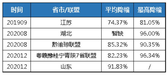 9月5日,重庆市医保局发布通知,贵州、重庆、海南三省联盟完成带量采购,总体降幅85.32%,其中预扩组平均降幅达85.49%,最高降幅为89.84%;后扩组平均降幅达85.15%,最高降幅为90.35%。