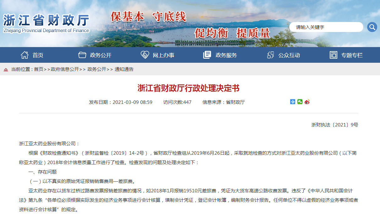 3月9日,浙江省财政厅发布通告,就2019年浙江省财政厅对浙江亚太药业股份有限公司的会计信息质量检查作出“浙江省财政厅行政处理决定书”。亚太药业正是财政部对77家药企进行穿透式检查中归属浙江省检查的两家药企之一,浙江省财政厅检查的另一家药企为浙江仙琚制药股份有限公司。根据通告,浙江省财政厅在检查中发现了亚太药业在销售费用方面的问题:亚太药业存在以货车过桥过路费发票报销差旅费的情况,如2018年1月报销19510元差旅费,凭证为大货车高速公路收费发票。违反了《中华人民共和国会计法》第九条“各单位必须根据实际发生的经济业务事项进行会计核算,填制会计凭证,登记会计帐簿,编制财务会计报告。任何单位不得以虚假的经济业务事项或者资料进行会计核算”的规定。1.亚太药业与浙江长典医药有限公司(以下简称长典医药)签订市场调查服务、药事管理服务等合同,存在同一合同调研地点前后不一致、工作总结完成日早于合同签订日,不同合同在会议照片等方面高度雷同等情况。2.亚太药业与长典医药签订销售流向查询合同,但长典医药所提供销售流向查询结果中的医疗机构非合同约定地区的医疗机构。上述行为违反了《中华人民共和国会计法》第十四条“会计机构、会计人员必须按照国家统一的会计制度的规定对原始凭证进行审核,对不真实、不合法的原始凭证有权不予接受,并向单位负责人报告;对记载不准确、不完整的原始凭证予以退回,并要求按照国家统一的会计制度的规定更正、补充”的规定。从上述内容看出,亚太药业与CSO合作的服务内容涉及:市场调查、药事管理服务、流向查询,与行业中很多药企与CSO合作的内容相似甚至完全相同。