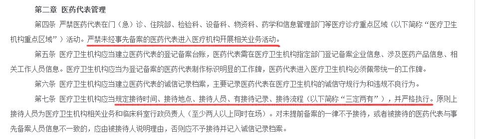 办法提到,医疗机构接待医药代表时应该“规定接待时间、接待地点、接待人员、有接待记录、接待流程”,以此称为三定两有。并且医药代表是需要提前备案的,未备案的一律不予接待。