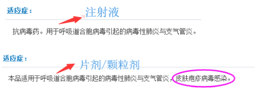 利巴韦林注射液说明书中明确表明,请看下图,片剂和颗粒剂行均增加了一句“皮肤疱疹病毒感染。”