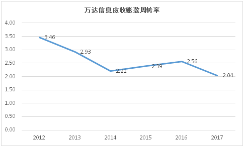 我们再来看看万达信息的应收账款周转率,2017年,公司应收账款的周转率为2.04,和往年相比也是越来越差,转换成应收账款天数则为180天左右。