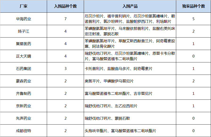 华海药业是本次采购目录中的亮点,华海药业有7个品种入围,其中盐酸帕罗西汀片、利培酮片、福辛普利钠片、赖诺普利片、氯沙坦钾片5个产品目前为独家通过一致性评价药品,而且通过历史中标数据来看,除了福辛普利钠片,其余4个品种在2018年全国平均中标价中,原研厂家与华海的价格相差较大,福辛普利钠片略低于原研药,因此华海这5个产品线占据优势,极有可能在试点城市的医药市场拔得头筹。