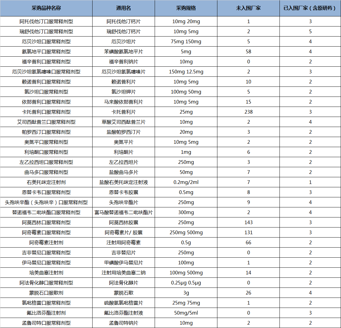 截止至11月份为止,一共有46家企业符合本次带量采购要求,其中,仿制药厂家共30家,原研企业16家。