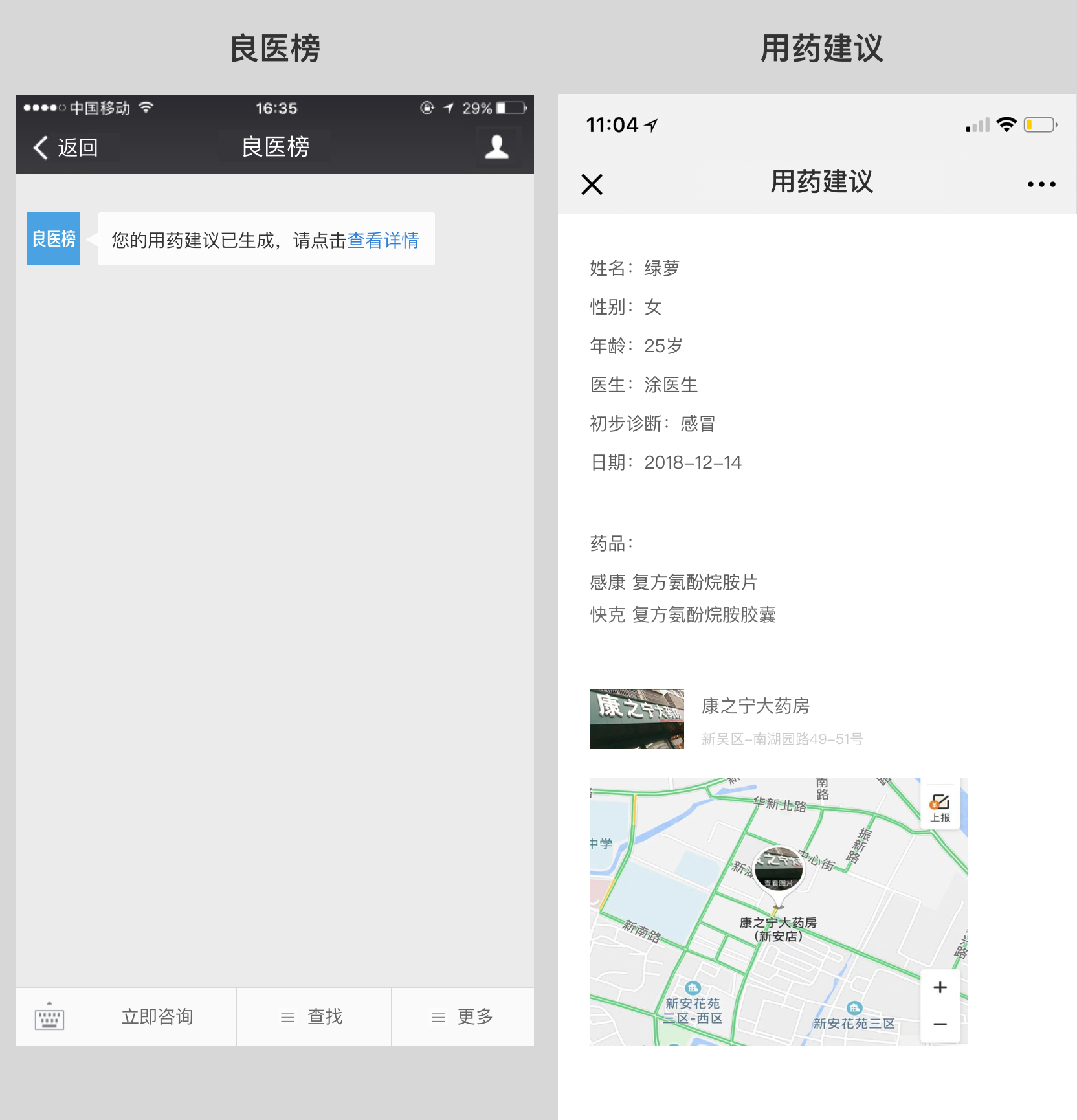 场景一,患者在线下医院问诊的时候,使用微信扫描医生的专属二维码,添加医生后可用微信与医生实现在线的沟通与随访。医生通过医库APP在线与患者交流,开具用药建议并选择就近及长期合作的药房后,将用药建议和药店地址推送给患者。患者通过电子的用药建议单去医生推荐的药店购买药品,处方以及最后的药师审核由药店自行完成。