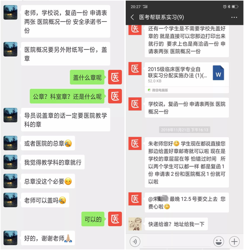 (2)医考帮与实习单位联系确认实习盖章的聊天记录;