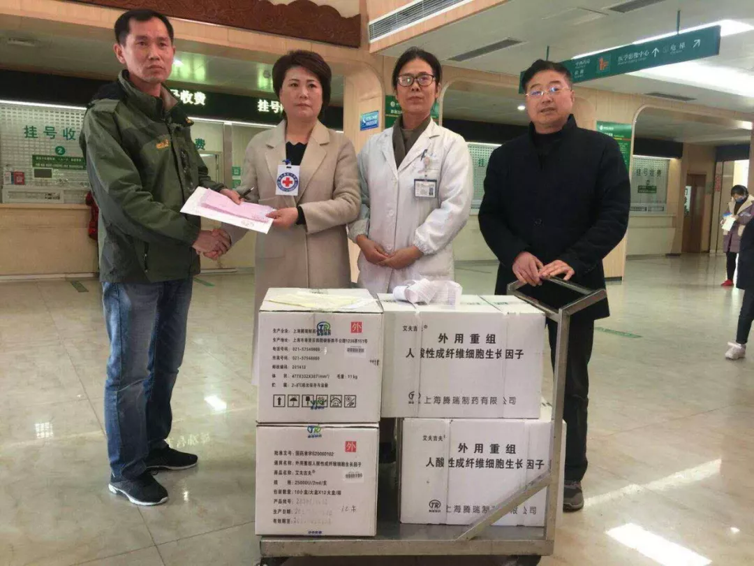 3月23日,上海腾瑞制药紧急调拨,第一时间捐赠给响水县红十字会的外用重组人酸性成纤维细胞生长因子(艾夫吉夫)已到达当地医院,大批烧伤与创伤患者急需此产品,特别是各种烧伤创面,慢性溃疡创面和外伤后残余创面愈合!