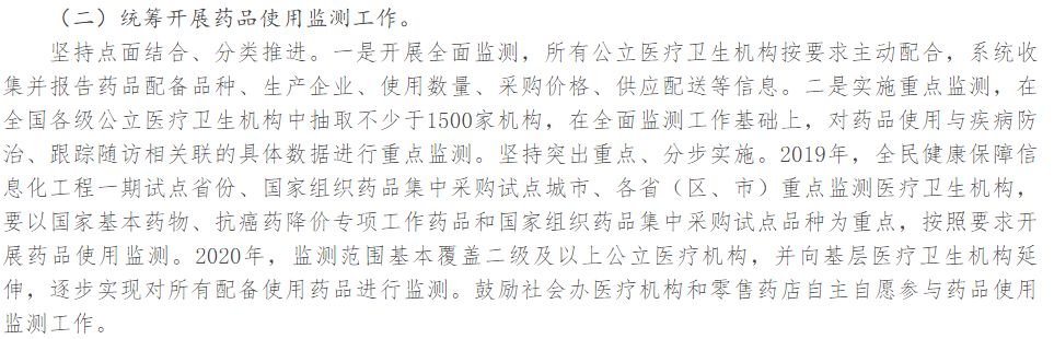 2019年,全民健康保障信息化工程一期试点省份、国家组织药品集中采购试点城市、各省(区、市)重点监测医疗卫生机构,要以国家基本药物、抗癌药降价专项工作药品和国家组织药品集中采购试点品种为重点,按照要求开展药品使用监测。