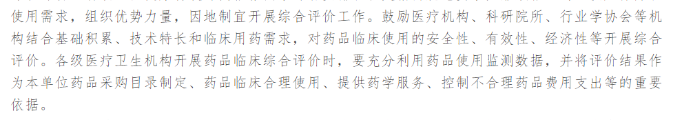 鼓励医疗机构、科研院所、行业学协会等机构结合基础积累、技术特长和临床用药需求,对药品临床使用的安全性、有效性、经济性等开展综合评价。