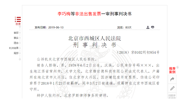 上述《判决书》显示,郭锋为北京雅世德公司法定代表人,郭锋被指控为非法谋取利益,指使并伙同被告人张崔,非法从他人处收买餐饮发票,郭锋并伪造多家餐饮公司印章,用于制作虚假POS机小票、餐饮流水单,并将上述发票及假的POS机小票、餐饮流水单一并用于向他人出售。