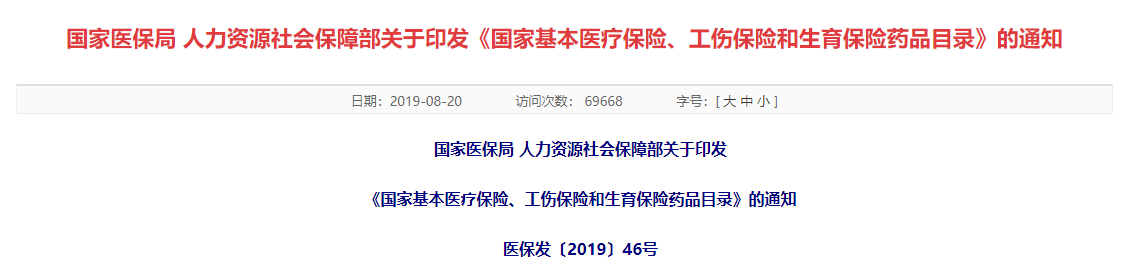 8月20日,2019版《国家基本医疗保险、工伤保险和生育保险药品目录》正式出台,新版目录自2020年1月1日起正式实施,2017年版目录同时废止。