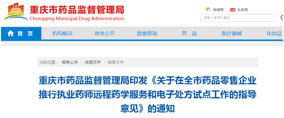 8月5日,重庆市药品监督管理局印发《关于在全市药品零售企业推行执业药师远程药学服务和电子处方试点工作的指导意见》的通知,推行执业药师远程药学服务和电子处方的试点工作。