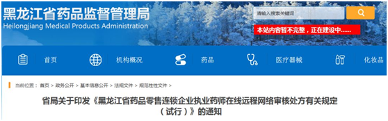 8月6日,黑龙江省药品监督管理局官网也发布了《黑龙江省药品零售连锁企业执业药师在线远程网络审核处方有关规定(试行)》通知,旨在提高零售连锁企业药学服务和质量管理水平,规范和推动执业药师在线远程网络审核处方工作。