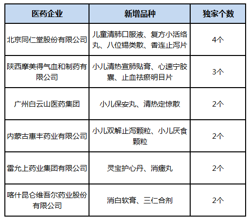 2、新入的独家中成药品种:药品范围广,涉及多家中药企业