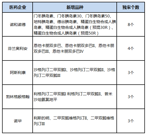 从内外资药企来看,独家西药品种中,超过一半是进口药,有48个。而国产药只有26个。进口药品涉及23家大型跨国药企,而且大多数外企都有至少两个独家品种,例如诺和诺德(8个)、芬兰奥利安(4个)、阿斯利康(3个)、勃林格殷格翰(3个)、诺华(3个)等。