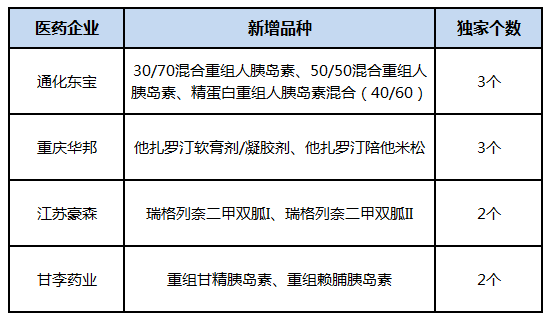 再来看新晋的独家国产药,只有26个,涉及本土药企20家。相比获益的中成药企业和外资药企,新版目录让本土的药企获益面相对更小了。本次获益的、有新增多个独家药品的本土企业有:通化东宝(3个)、重庆华邦(3个)、甘李药业(2个)、江苏豪森(2个)。