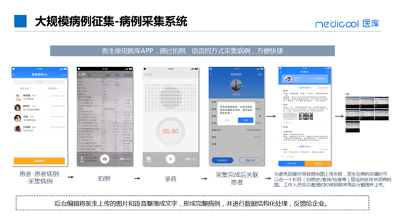 医生通过文字、拍照或者录音的方式收集病例、随访患者。医学编辑会将收集到的有效病例进行人工整理,形成格式化病例并汇总。