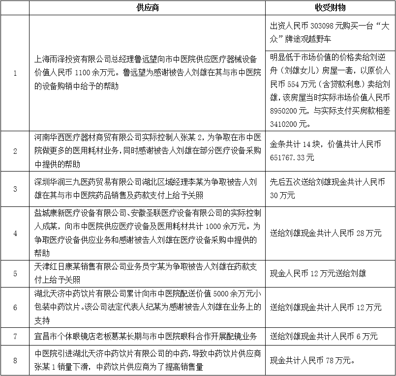 根据法院判决书认定的犯罪事实,刘雄在数年间利用职务之便主要收取了多人的财物,除了大量现金,赃物还包括一辆汽车、14块金条,以及在上海低价购得的一套房产。根据证据显示,本案涉及众多中医院的供应商。包括:上海雨泽投资有限公司、河南华西医疗器材商贸有限公司、深圳华润三九医药贸易有限公司、盐城康新医疗设备有限公司、安徽圣联医疗设备有限公司、天津红日康某销售有限公司、湖北天济中药饮片有限公司、中药饮片供应商,还有宜昌市个体眼镜店。