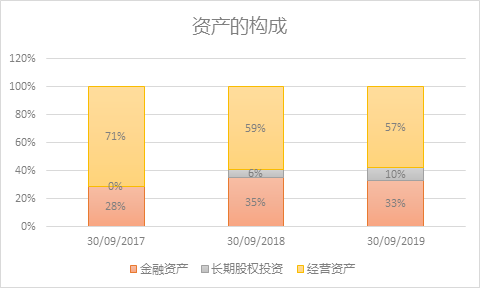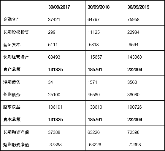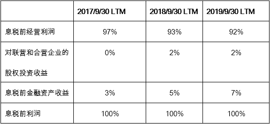 截止于2019年9月30日的过去12个月, EBIT(息税前利润)的92%来自经营利润,较2017年的97%略有下降。这主要是因为对联营和合营企业的股权投资开始产生收益, 以及金融资产所产生的收益有所上升所致。EBIT的7%来自金融资产的收益,对联营和合营企业的股权投资收益则占2%。(见表6)