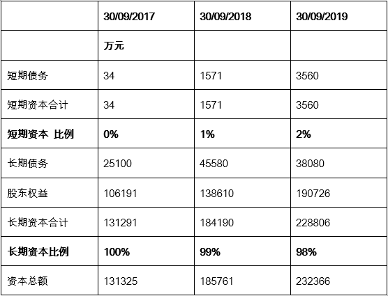 我们从通策医疗的资本结构(见表1)中可知, 2019年第三季度的长期资产占比为98%, 短期资本仅为2%。长期资本中以股权资本为主,占长期资本总额的83%。