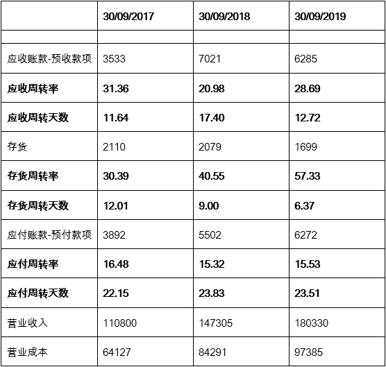 表4中显示, 截止于2017年9月30日, 应收周转天数为12天, 存货的周转天数也为12天, 也就是说其营业周期为24天。同年, 公司大约用了22天来支付应付账款。营业周期和应付账款周转天数之间的差额为2(24-22)天, 这2天就是2017年通策医疗的现金周期。两年后,我们发现公司的应付账款周转天数为24天,较两年前增加了两天,但增长并不明显。但是,营业周期为19天, 较2017年减少了5天, 这主要归功于存货周转天数的大幅减少。现金周期则为-5天(19天-24天),较2017年同期(2天)减少了7天。一般来说,营业周期和现金周期越短, 公司的管理效率就越高。由此可见, 通策医疗的管理层对营运资本的管理效率是大大提高了。营运资本管理效率的增长, 加快了存货的流动性, 也使其营运资本由正值转为负值, 在这种情况下,公司则无需在营运资本上进行投入。相反,营运资本还可以产生现金反哺公司。