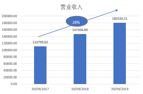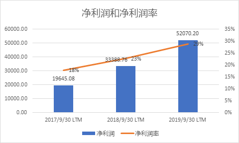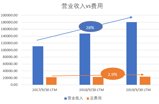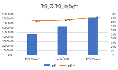截止于2019年9月30日的过去12个月,通策医疗共创造了18亿元营业收入, 较去年增长22%,过去三年的CAGR为28%。(见图2),毛利率为46%, 较过去两年略微上升, 主要原因是营业成本占营业收入的比例在过去两年有所下降所致(见图3)。