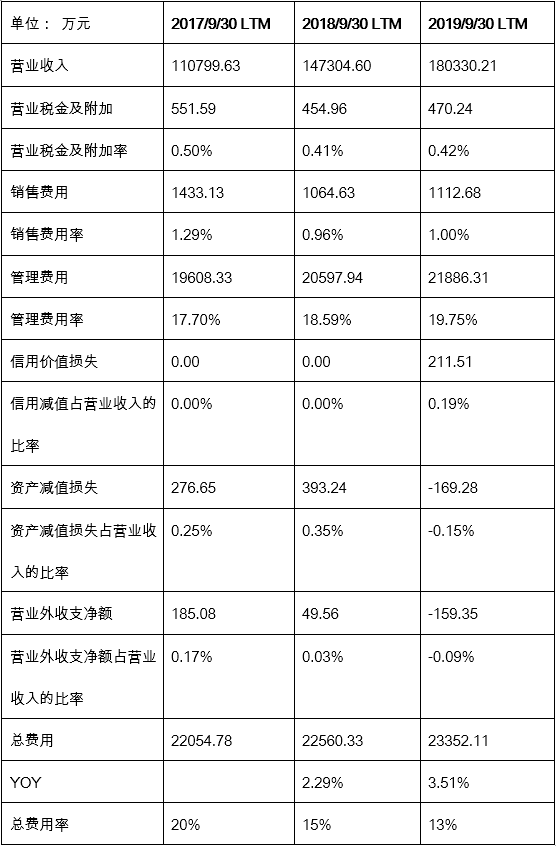 从2019年第三季度来看, 通策医疗共拥有价值大约23.2亿资产, 其中金融资产为7.6亿元, 占资产总额的33%;长期股权投资2.3亿元, 占比10%,以及13.3亿的经营资产, 占比57%。我们从通策医疗的资产构成(见图1)可见, 金融资产为7.6亿元, 其中货币现金为4亿元,其他权益工具投资为3.6亿, 应收股利和应收利息加起来则为2000万元左右。预计未来还会略微下调。长期股权投资为资产总额的10%,2017年这个占比为零。经营资产(营运资本+长期经营资产)从过去三年的趋势来看,从2017年同期的71%降到2019年的57%。从经营资产的结构来看, 长期经营资产(62%)则远高于营运资本(-4%), 营运资本为负值,这说明通策医疗在经营性营运资本的使用效率很高,营运资本完全无须投入, 还可以产生现金反哺长期经营资产。公司的长期经营资产占比也显示通策医疗是一个重资产的企业,这种类型的企业的一个特征就是其固定成本较高, 从而导致企业的经营杠杆较高。如果收入出现下滑, 其利润下滑的幅度会更大。