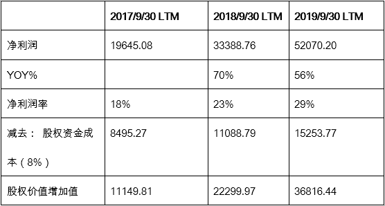 通策医疗净利润的增长十分显著, 净利润率从2017年同期的18%增长到2019年的29%。(见图6) 我们假设公司权益资本的成本为8%的话, 净利润在扣除股权资金成本之后,价值的增加值在过去三年分别为1.1亿,2.2亿以及3.7亿元, 也就是说公司在满足了债券人和股东的预期回报之后, 连续为股东创造了额外的回报(见表7)