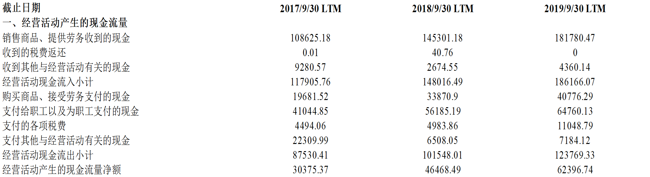 截止于2019年9月30日的过去12个月, 通策医疗创造了5.2亿元的净利润。利润的质量是高是低,我们需要看看该净利润是否有足够的现金来支撑,截止于2019年9月30日过去12个月的经营活动现金净流入为6.2亿元。(见表8)
