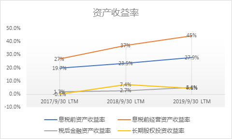 从资产的效率来看,息税前资产收益率为28%, 较过去两年都有大幅增长。28%的资产收益率主要源自经营资产收益率的大幅提升, 但又给金融资产收益率(5.1%)和长期股权投资收益率(4.6%)等较低的收益率拖了后腿。(见图7)