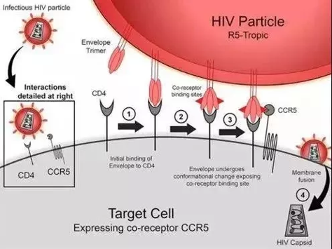 众所周知,正常人体抵御疾病有一套完整的免疫机制,而在这套机制中,有一种名为CD4+T细胞发挥着巨大的作用。艾滋病就是一种由人类免疫缺陷病毒(HIV,一种逆转录病毒)导致的疾病,HIV进入人体后就会找到CD4+T细胞,并通过位于细胞表面的CCR5受体侵入细胞内,慢慢导致细胞死亡和破坏。细胞消亡殆尽后HIV就会出来,再次通过其他细胞上的CCR5受体继续入侵和破坏,周而复始。