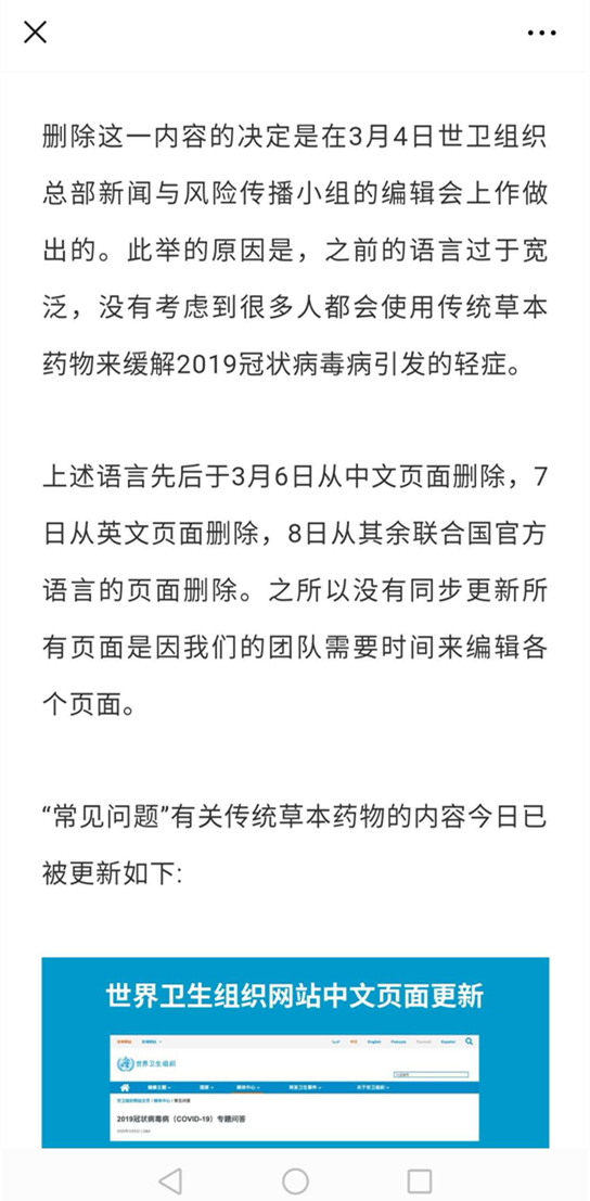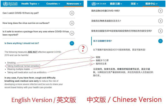 3月6日,世界卫生组织官网的一个栏目“2019冠状病毒病(COVID-19)专题问答”,里面有个“应对疫情,我不该做哪些事情?”的回答:“以下措施不能有效应对2019冠状病毒病,甚至可能有害:……”中文版本:不能有效应对2019冠状病毒病,甚至可能有害的是:1、吸烟。2、佩戴多个口罩。3、服用抗生素。除中文外的其他五种语言版本,除了上述3点之外,还有1点是 “不要使用传统中草药疗法”。也就是传统中草药对疫情防治无用或有害的表述在中文版本里直接删除了。这是BUG吗?当然不是,这是我国翻译的中文版特地删除了(不要)使用传统中草药的说法。更神奇的事情是,过了一天WHO官网删除了相关的英文表述,但是其他语言的版本仍然建议大家不要使用中草药。直到3月8日,这个表述才从其余联合国官方语言页面删除。对于为何删除该表述的原因,WHO给出的解释是:之前语言过于宽泛,没有考虑到很多人都会使用传统草本药来缓解2019冠状病毒引发的轻症。然而WHO作为国际权威的组织之一,认为中草药对新冠无效显然不可能是信口开河,而即使在受到中国的异议时,虽然删除,但其实却再次强调只是忽略了可以缓解“轻症”,那么其实大部分轻症患者是可以自愈的,所以缓解轻微症状以及很多人“都相信其可以缓解”有一定安慰剂效应,那么换句话说,对于中重症患者没有治疗价值甚至有害,这是WHO的官方观点!然而中草药,成药和中药注射液至上而下地活跃在中国的抗疫治疗中,无论病情轻中重,成为一种独特的文化!
