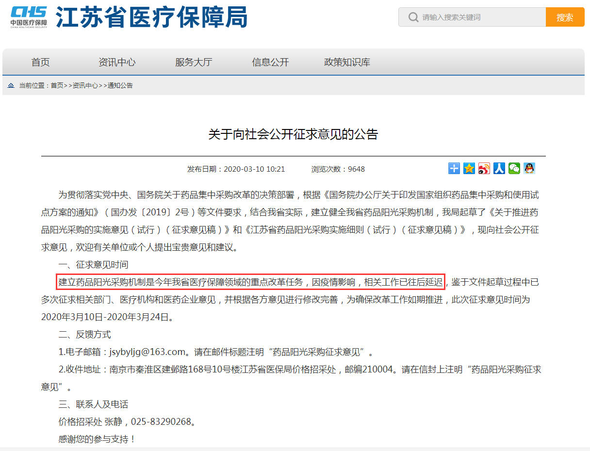 2、江苏:鼓励医疗机构或医疗联合体开展组团或拼单议价。3月10日,江苏省医疗保障局官网更新消息,该局起草了《关于推进药品阳光采购的实施意见(试行)(征求意见稿)》。其中议价采购:医疗机构议价,所有公立医疗机构使用药品均须在省平台上阳光采购、公开交易。除国家谈判药品、国家定点生产药品等,其余省平台挂网药品,医疗机构均可在省平台挂网价下,结合自身采购量,与生产企业进行实质性议价,并按议价结果采购。鼓励医疗机构或医疗联合体开展组团或拼单议价,进一步降低药品价格,议价结果供参考组团或拼单的医疗机构共享。