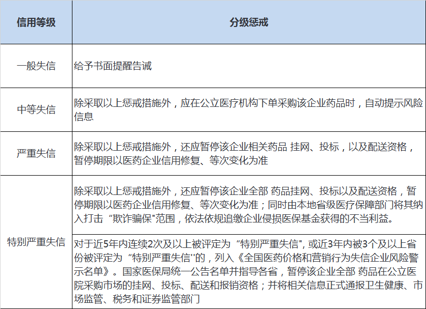 4-5、建立医药企业价格和营销失信行为信用评价制度与分级惩戒制度。按照医药企业失信行为的性质、情节、时效,以及影响范围等因素,将医药企业失信情况评定为一般、中等、严重、特别严重四个等次,四个信用评价等级,惩戒与集采、挂网、配送以及“欺诈骗保”挂钩。