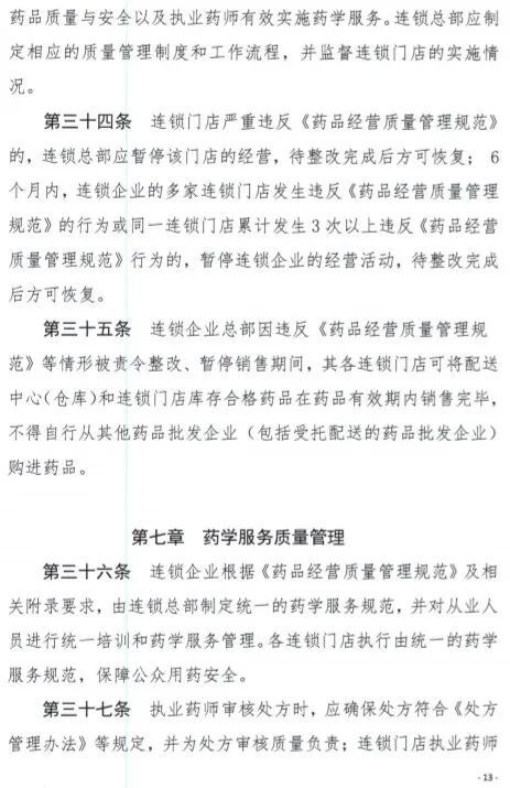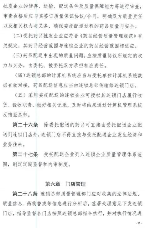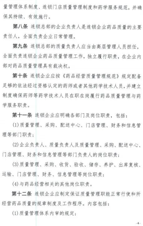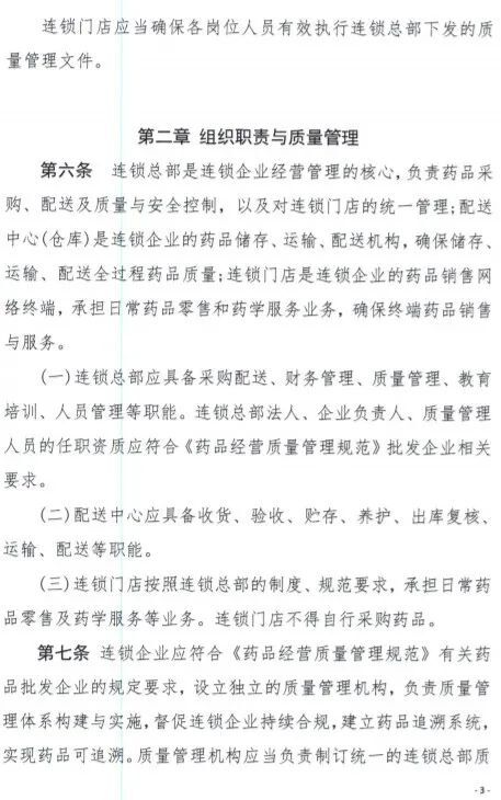 《征求意见稿》要求连锁企业应当建立统一的质量管理体系。连锁总部应当对所属连锁门店在计算机系统、釆购配送、票据管理、药学服务等方面统一管理,依据统一的质量管理制度,对所属连锁门店的经营活动履行管理责任。