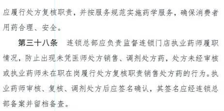 《征求意见稿》明确连锁企业应按《药品经营质量管理规范》规定配备足够的依法经过资格认定的药师或者其他药学技术人员,并建立制度确保药师等药学技术人员在职在岗履行药品质量管理与药学服务职责。连锁总部应负责监督连锁门店执业药师履职情况,防止出现未凭医师处方销售、调剂处方药,处方未经审核或执业药师未在职在岗履行处方复核职责销售处方药的行为。执业药师审核、复核、调剂处方后应签名确认,其签名应经连锁总部备案并留档备查。