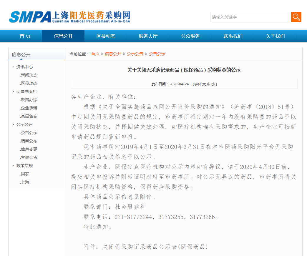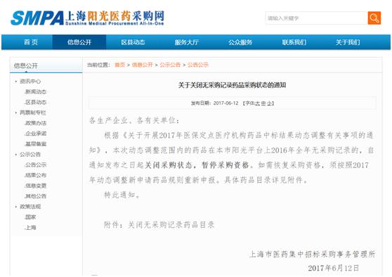 4月24日,上海阳光医药采购网发布两份文件《关于关闭无采购记录药品(医保药品)采购状态的公示》和《关于关闭无采购记录药品(自费药品)采购状态的通知》。上海市市药事所将定期对一年内没有采购量的药品予以关闭采购状态,并择期做失效处理。医疗机构确有采购需求的,生产企业可按新申请药品规则重新申报。
