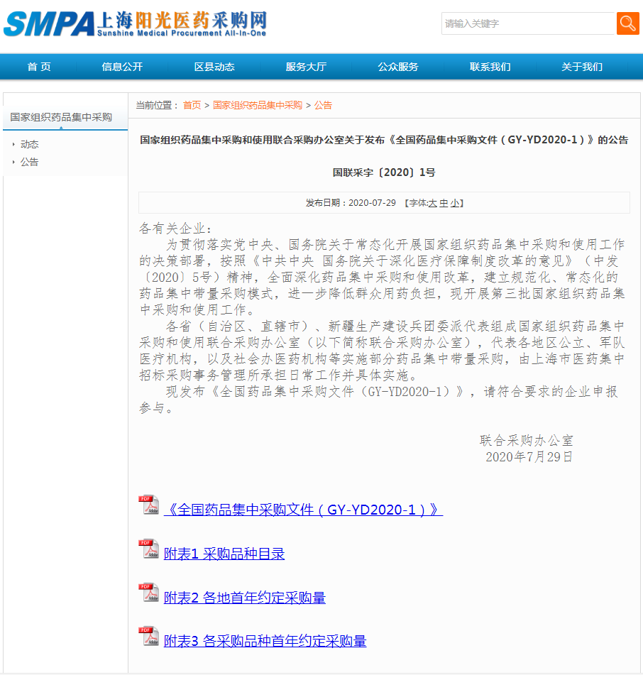 7月29日,上海阳光医药采购网印发通知称,现开展第三批国家组织药品集中采购和使用工作,相关企业应在8月20日上午7点30分开始接收申报材料。与此前地方报量文件相同,联采办的正式目录中共涉及56个品种,86个品规,这一规模与此前两轮集采之和相当。联采办的正式目录中共涉及56个品种,86个品规,对比前两批的25个和33个品种,有大幅扩容的情况。56个品种中,涉及头孢地尼口服常释剂型、莫沙西星氯化钠注射液等多个抗菌药物,亦有氯氮平口服常释剂、西酞普兰口服常释剂型等精神用药,同时包含部分高血压、糖尿病用药,如竞争激烈的二甲双胍,是公认的2型糖尿病患者一线治疗药物。与此前两批集采相同的是,这一轮集采也涉及了众多企业的亿元级品种。米内网数据显示,第三批集采品种在2019年中国城市公立医院、县级公立医院、城市社区中心以及乡镇卫生院(简称中国公立医疗机构)终端合计销售额超过560亿元,其中有23个药品销售额超过10亿元,缬沙坦口服常释剂型、二甲双胍口服常释剂型、卡培他滨口服常释剂型分别以49.64亿元、43.08亿元、34.91亿元位列前三。从正式文件来看,第三批国采维持了第二批的基本架构,只有部分规则微调。