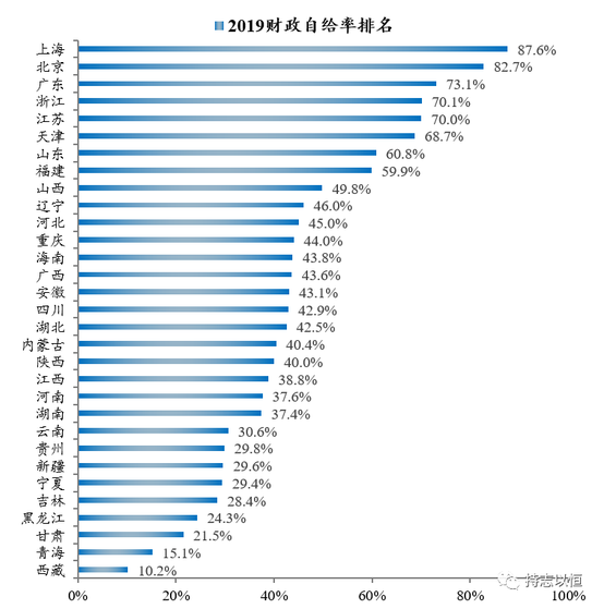 整个中国2019年,特别是到2020年,国家财政税收持续下行,各省市的财政收入也大幅下降。根据恒大研究院高级研究员罗志恒的研究报告,2019年财政未完成全年预算任务,财政税收增速低,税收增速创半个世纪以来新低。2019年全国财政收入为190382亿元,完成率为98.9%,为近年低点。2019年财政收入增速3.8%,低于预算目标的5%,该增速为1987年以来的最低增速。2019年财政收入少于预算2118亿元,但支出却高于预算3630亿元,增速8.1%,高于预算的6.5%,支出预算执行率为101.5%。官方赤字为2.76万亿,但实际上的收支差为4.8万亿,中间的差额通过历史结转结余资金、政府性基金和国有资本经营预算调入解决。考虑到2.15万亿的专项债,实际赤字率高达7.1%。2019年23个省市财政自给率不足50%。2019年各省市财政收入/支出低于50%的有23个,主要集中在西部和东北,仅8个省市财政自给率高于50%,主要是上海87.6%、北京82.7%、广东73.1%、浙江70.1%、江苏70%、天津68.7%、山东60.8%和福建59.9%。地方政府收支不足主要靠中央对转移支付和税收返还以及地方政府一般债券。医疗、民生、甚至公务员工资,由于受财政总收入总预算下降的影响,将会捉襟见肘,地方政府尤其是基层政府哭爹喊娘,甚至发不出公务员和教师工资已不稀奇。收入减少的同时支出不断加大,由于防疫带来的直接额外医疗支出和间接社会总成本增加。