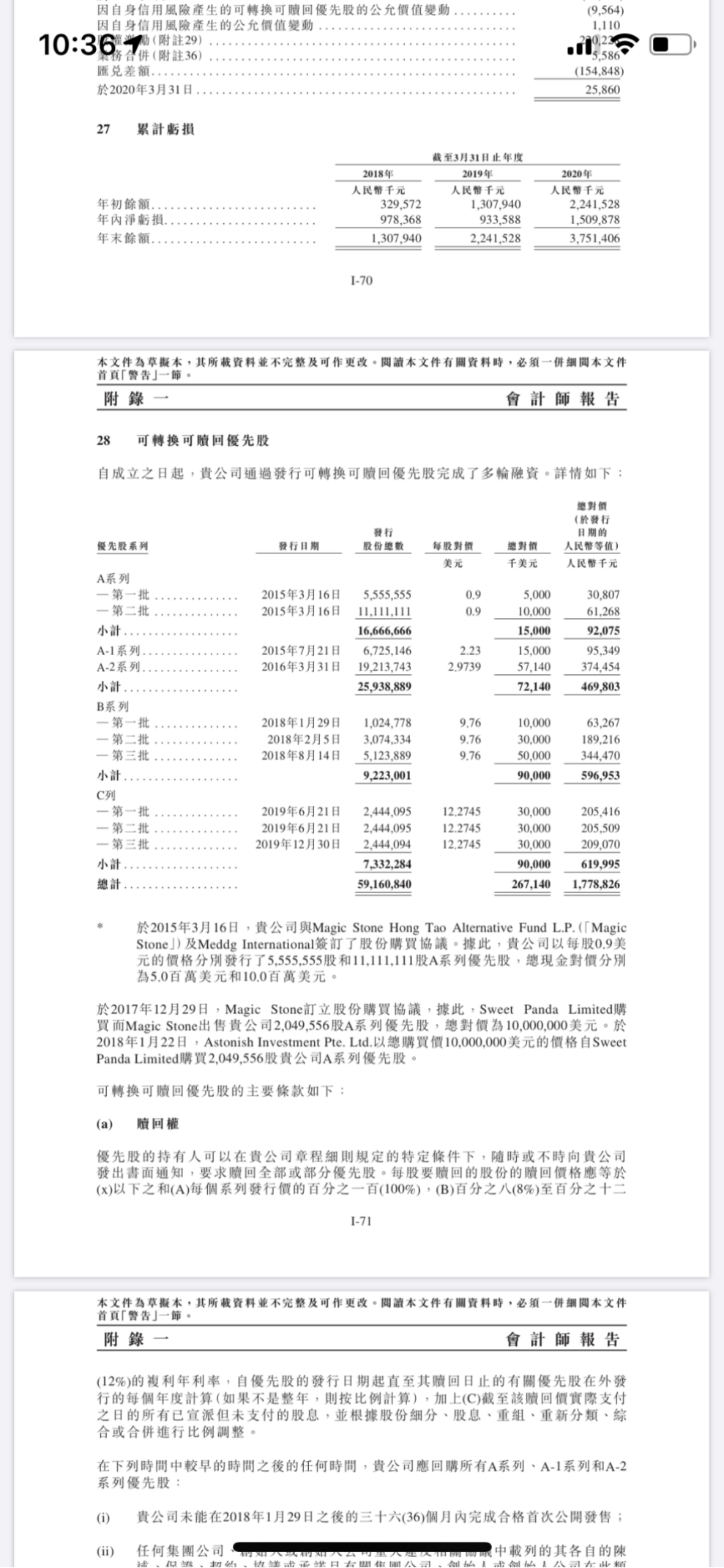 我们看了一下优先股对赌条款,可以要求100%赎回,年利率8%-12%的复利年利率,目前参考图8的财务费用,2020年为约420万,可见并没有完全足额支付利息,只给了一小部分,甚至融资的钱存款或理财还收入了约550万。对赌要求是2018年1月29日后36个月(有一些入得晚的优先股,时间顺延),也就是2021年1月29日前不上市的话,投资方有权使用赎回权并获得复利的利息,也就是对赌失败之后,将变成明股实债!本金另算,仅利息将复合增长至超过5亿!到现在还有不到5个月,也就是说此次如果上市不成,该公司将会产生巨大的经营风险!