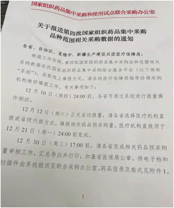 12月9日,一份名为《第四批国家组织药品集中采购品种范围相关采购数据的通知》在网络中流传。该文件详细介绍了第四批药品集采的填报工作,包括时间、流程、以及各省医保局送报联合采购办公室的注意事项。