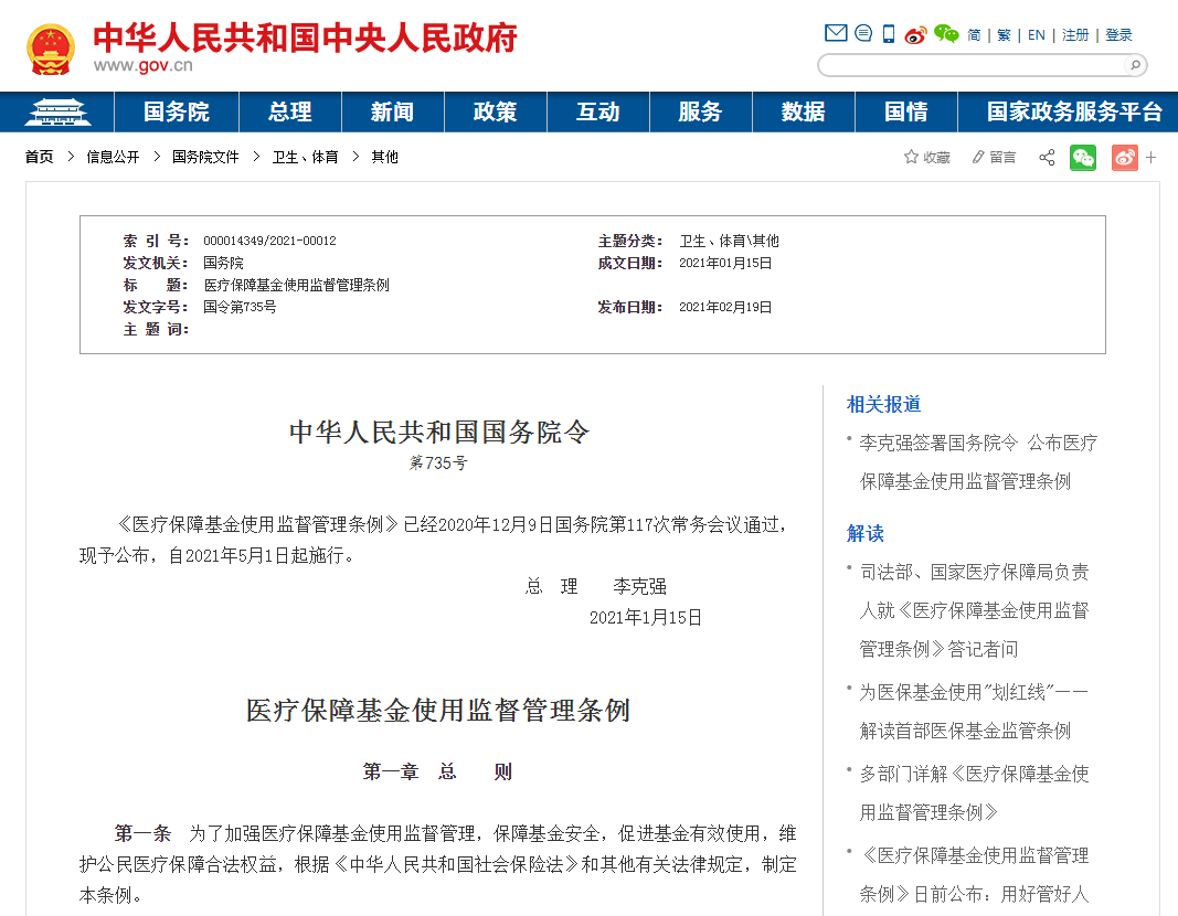 2月19日,中国政府网消息,国务院发布《医疗保障基金使用监督管理条例》(下称《条例》,明确了我国境内基本医疗保险(含生育保险)基金、医疗救助基金等医疗保障基金的使用及监管,并自2021年5月1日起施行。长期以来,由于医保领域法制缺失,受监管制度体系不健全、激励约束机制不完善等因素制约,现实中各种违规违法使用医保基金的现象层出不穷,医保基金在一定程度上被一些机构与个人当成了“唐僧肉”,医保基金使用效率不高,欺诈骗保问题普发频发,违规违法使用造成基金流失。基金监管形势较为严峻。该《条例》是首部医保监管条例。条例明确,骗取医疗保障基金支出的,由医疗保障行政部门责令退回,处骗取金额2倍以上5倍以下的罚款,对直接负责的主管人员和其他直接责任人员依法给予处分。基金使用监督管理条例的推出可保障基金安全,促进基金有效使用,维护公民医疗保障合法权益。《条例》共计50条具体内容,包括总则、基金使用、监督管理、法律责任、附则五大方面。一是监管主体。医保基金使用主体主要包括医疗保障经办机构、定点医药机构和参保人员;医保基金监管主体除医疗保障行政部门外,还包括与此项工作有关的各部门等。《条例》第九条还特别提出“国家建立健全全国统一的医疗保障经办管理体系,提供标准化、规范化的医疗保障经办服务,实现省、市、县、乡镇(街道)、村(社区)全覆盖”,为强化具体负责基金使用管理的医疗保障经办机构建设提出了要求。二是各方责任。《条例》明确了各方主要责任:医疗保障经办机构要健全业务等管理制度、做好协议管理(包括建立协商谈判机制)、信息公开、基金拨付等工作;定点医保机构要按规定提供医药服务并建立医保基金使用内部管理制度等;参保人员在就医、购药过程中也要遵守医保相应规定,不得获得非法利益。“定点医药机构及其工作人员,应当执行实名就医和购药管理规定,核验参保人员医疗保障凭证,按照诊疗规范提供合理、必要的医药服务,向参保人员如实出具费用单据和相关资料,不得分解住院、挂床住院,不得违反诊疗规范过度诊疗、过度检查、分解处方、超量开药、重复开药,不得重复收费、超标准收费、分解项目收费,不得串换药品、医用耗材、诊疗项目和服务设施,不得诱导、协助他人冒名或者虚假就医、购药。定点医药机构应当确保医疗保障基金支付的费用符合规定的支付范围;除急诊、抢救等特殊情形外,提供医疗保障基金支付范围以外的医药服务的,应当经参保人员或者其近亲属、监护人同意。”《条例》第十八条到二十一条,医疗保障基金专款专用,任何组织和个人不得侵占或者挪用。1、在医保基金使用过程中,医疗保障等行政部门、医疗保障经办机构、定点医药机构及其工作人员不得收受贿赂或者取得其他非法收入。2、参保人员不得利用其享受医疗保障待遇的机会转卖药品,接受返还现金、实物或者获得其他非法利益。定点医药机构不得为参保人员利用其享受医疗保障待遇的机会转卖药品,接受返还现金、实物或者获得其他非法利益提供便利。3、医疗保障经办机构、定点医药机构等单位及其工作人员和参保人员等人员不得通过伪造、变造、隐匿、涂改、销毁医学文书、医学证明、会计凭证、电子信息等有关资料,或者虚构医药服务项目等方式,骗取医疗保障基金。三是监督管理要求。《条例》对医疗保障行政部门在基金监管中的责任和权力做了明确规定:一方面,医疗保障行政部门需加强服务协议管理和与有关部门的信息交换和共享、创新监管方式,并根据基金监管需要开展专项检查和部门联合检查;另一方面,在实施监督检查时,明确了医疗保障行政部门可进入现场检查等多项具体措施,并可依法委托符合法定条件的组织开展相应执法工作。《条例》还对医保基金监督管理中的工作程序、处理要求等做了明确。四是监管重点和处理办法。医保基金使用监管的重点行为和与之对应的惩戒措施是《条例》明确的重要内容。《条例》第三十六条至第四十一条,分别对医疗保障经办机构、定点医药机构和参保人员的违规违法行为及其惩戒办法做了规定。其中,需依法处理的各类情形,均是各种易发、多发违规违法行为,需要基金使用主体引以为戒;各类情形对应的处理办法,为基金监管方提供了明确的执行依据。