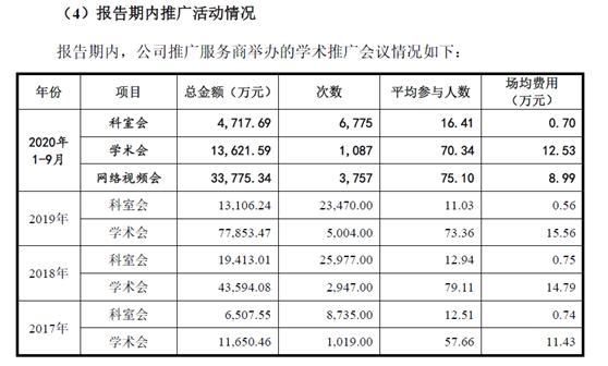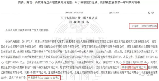 可见,学术推广费占的比重最大。2017年-2019年在业务推广费中占比超过50%。根据招股书,倍特药业的学术推广费是,推广商为推广公司产品召开的学术会或科室会所发生的开支。根据前面分析,倍特药业前几大服务商,大都有临时成立、并快速注销。再来看学术会议的费用,这些推广商承办的学术会议和科室会议的价格更是高得离谱,会议场次完全不合常理。招股书显示,2020年1月到9月,学术推广开了6775个科室会议,平均每天25个;召开1087个学术会议,平均每天4个;召开了3757个网络视频会议,平均每天13.9个。也就是说,在新冠流行的2020年,倍特药业的销售公司到各个医院给医生们每天开会交流学术问题。但是疫情期间全国医院严格管制,三令五申禁止禁止群体性集会,确定的集会也是有人数要求的。在医药代表都进不去医院的情况下,倍特药业怎么就能进去,而且把科室会开了,而且每天都能持续的开会?倍特药业是否有真实的会议材料和学术推广的证据链?科室会议共召开6775次,开会成本4717.69万,场均费用7000元,平均参加的人数16.41个。相当于平均每个医生每次426元。学术会议也就是市级别的,平均参加人数70.34人,一共开了1087次,花了1.36亿。每次开会的成本为12.53万,合每个医生成本为1781元/次。更夸张的是视频会议,我们都知道视频会议的最大好处是费用低廉,弄个Zoom或者腾讯会议什么的,最多注册年费几千元,一些专业直播平台单场一般也就收几千,一万多了不起了,而且是相对规模大的直播!而倍特药业一共花费了3.38亿开了3757个视频会议,场均费用8.99万,平均每次75.1个医生参加,合每个医生1197元/次。开个视频学术研讨会怎么给1197元呢?超高的学术推广费是谁签字通过的?保荐机构是否核实这些成本?有没有相应学术资料?还是费用过账补贴,通过平台方式洗钱,然后给医生做了转移支付呢?因为其招股说明书明确指出,支付的就是平台费,没有给医生的费用,那么如此畸形的费用,到底是哪个线上平台承接的?那么招股说明书中有2018年的业绩,但是公司2018年涉入一起虚开发票的,在无真实业务的情况下购买虚假广告推广费发票的刑事案件。据裁中国裁判文书网2019年10月12日发布的一则刑事判决书,《周勇、陈雪、肖震峰等虚开增值税专用发票、用于骗取出口退税、抵扣税款发票罪一审刑事判决书》(2019)川2002刑初83号显示,2018年1月,被告人周勇安排被告人陈雪、肖震峰借用他人身份信息在资阳市成立了5家公司,并于同年在无真实货物交易的情况下,以票面金额3%的手续费销售给成都倍特药业有限公司以及其他多家公司增值税普通发票364份,品名广告推广费,申报销售收入34119216.59元。填开发票的单位和个人都必须在发生真实的经营业务确认营业收入时开具发票,未发生经营业务一律不准开具发票。所以虚开发票本身就是一种违法行为,无论是买方还是卖方都要为该的违法行为负责,倍特药业在无真实业务的情况下购买虚假的广告推广费发票的行为已经违反了相关的法规。但在招股书中,倍特药业对此只字未提。那么,倍特药业购买增值税发票用于抵税的金额有多大?报告期内公司财务数据是否真实?相关诉讼及背后的财务规范漏洞是否对公司正常经营造成不利影响?购买假发票的成本是否已经审计到了,这些中介人员是否尽职尽责了?到底是利益问题,还是职业操守问题,还是水平问题呢?一系列问题尚待倍特药业及其保荐人回应、解释!